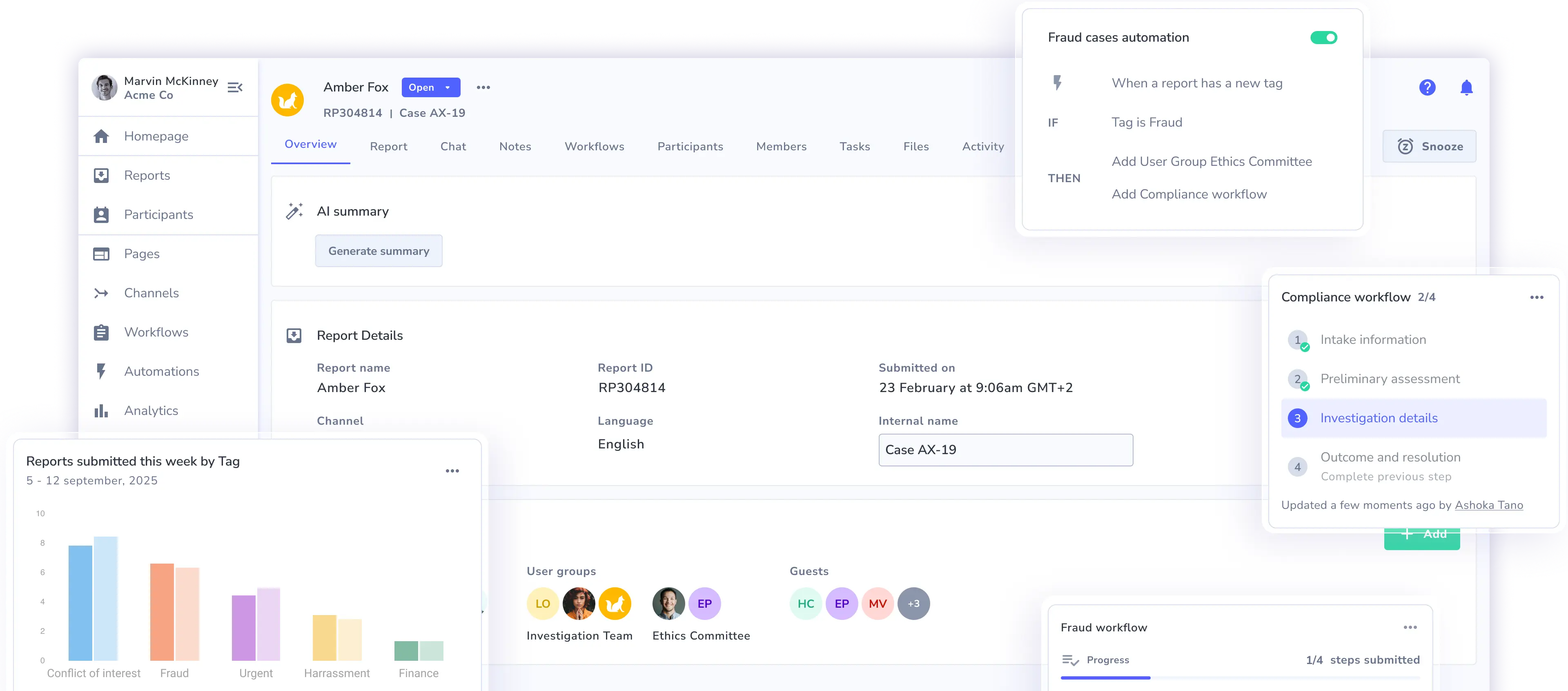 Once a disclosure is received, Whispli brings structure to case handling through configurable workflows and AI-assisted information-structuring. Compliance and HR teams can collaborate securely, apply consistent processes, and maintain clear follow-up from intake to resolution.