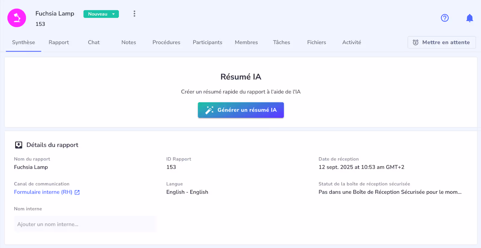 - Participants : gardez une vue d’ensemble claire de chaque enquête en identifiant toutes les personnes impliquées. Cette visibilité permet de suivre les interactions clés, de mieux connecter les informations et de renforcer la coordination entre vos équipes.