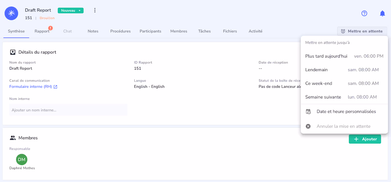 - Gestion des tâches : pilotez vos signalements avec plus de contrôle : mettez en pause les dossiers qui nécessitent un temps d’attente (informations manquantes, dépendances externes), priorisez les plus urgents pour concentrer vos efforts là où l’impact est immédiat, et programmez des rappels afin de relancer les équipes au bon moment. Résultat : une charge mieux répartie, des délais maîtrisés et un traitement plus rigoureux de chaque rapport.
