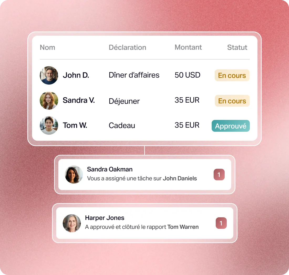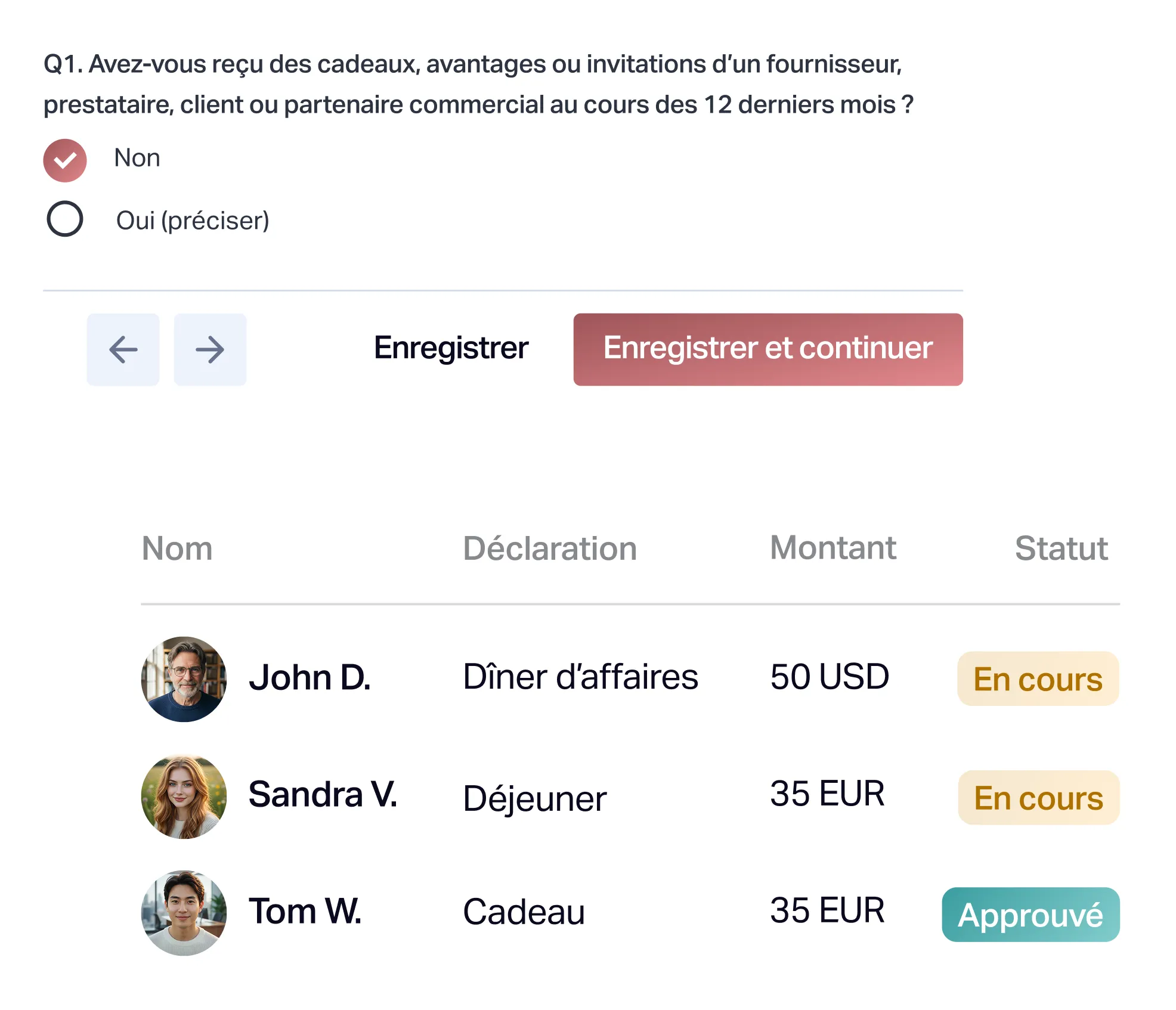 Chaque déclaration suit un workflow structuré pouvant inclure managers, équipes conformité ou approbateurs seniors. Les règles de routage et les circuits d’approbation sont configurables selon la valeur, le type ou le niveau de risque. Toutes les actions et décisions sont enregistrées automatiquement pour une traçabilité complète.