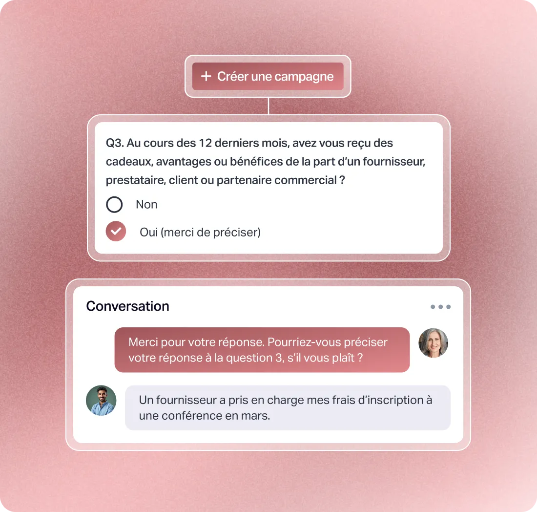 Offrez aux collaborateurs un parcours clair et guidé pour déclarer cadeaux, repas, invitations ou autres avantages. Whispli apporte de la clarté à chaque étape afin de garantir des déclarations complètes, fiables et conformes à vos politiques internes.