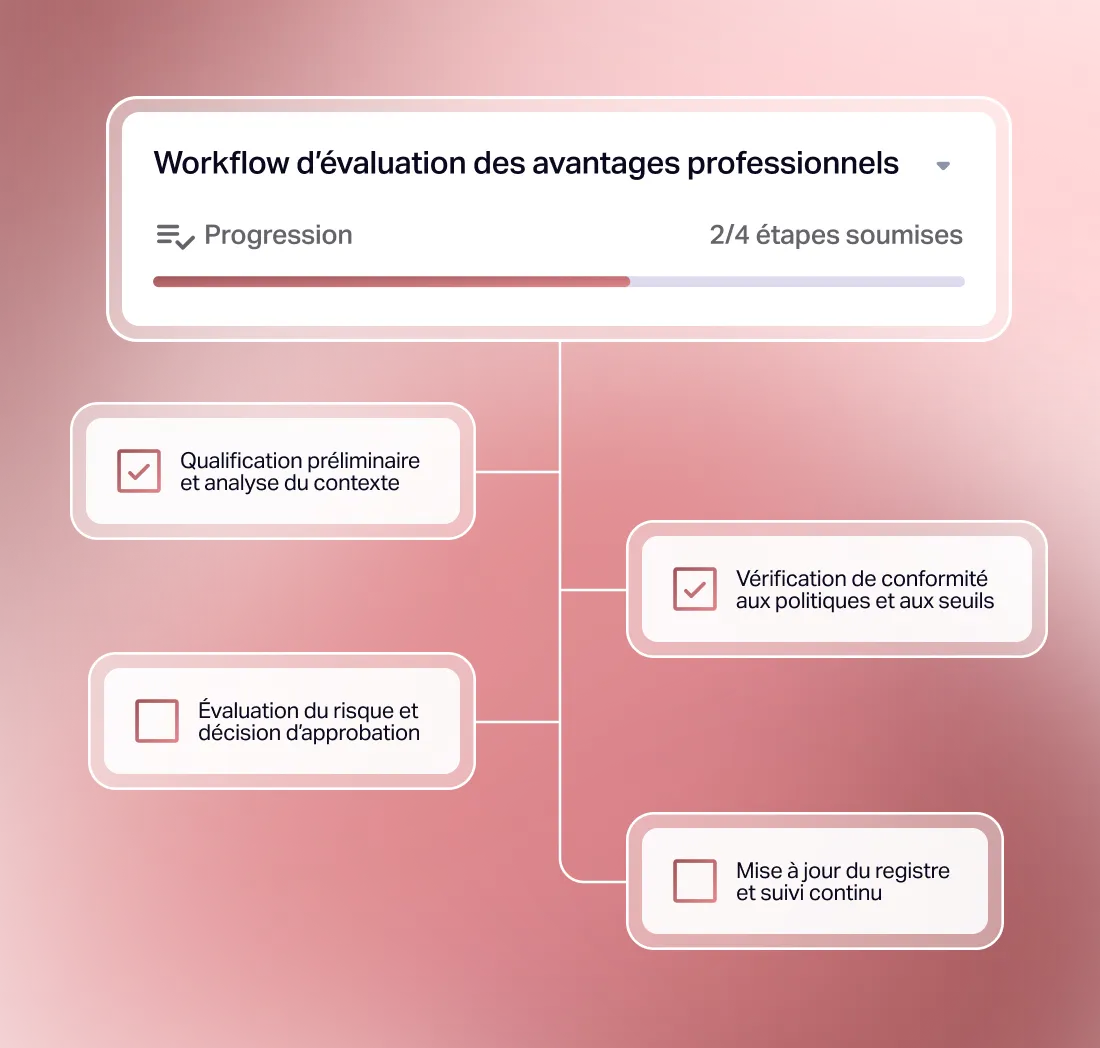 Maîtrisez la gestion des cadeaux, invitations et marques d’hospitalité grâce à des règles définies, des workflows automatisés et une traçabilité totale à chaque étape.