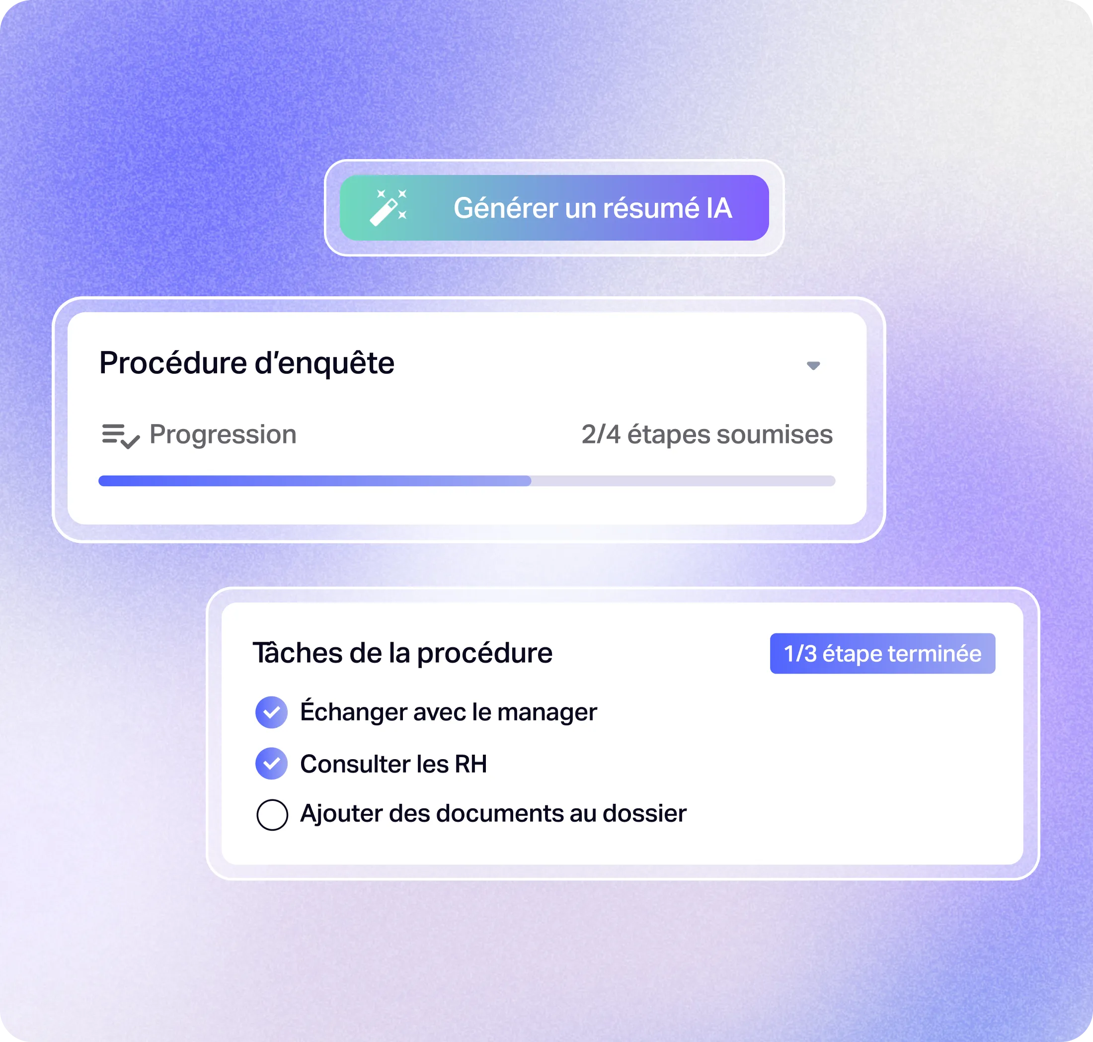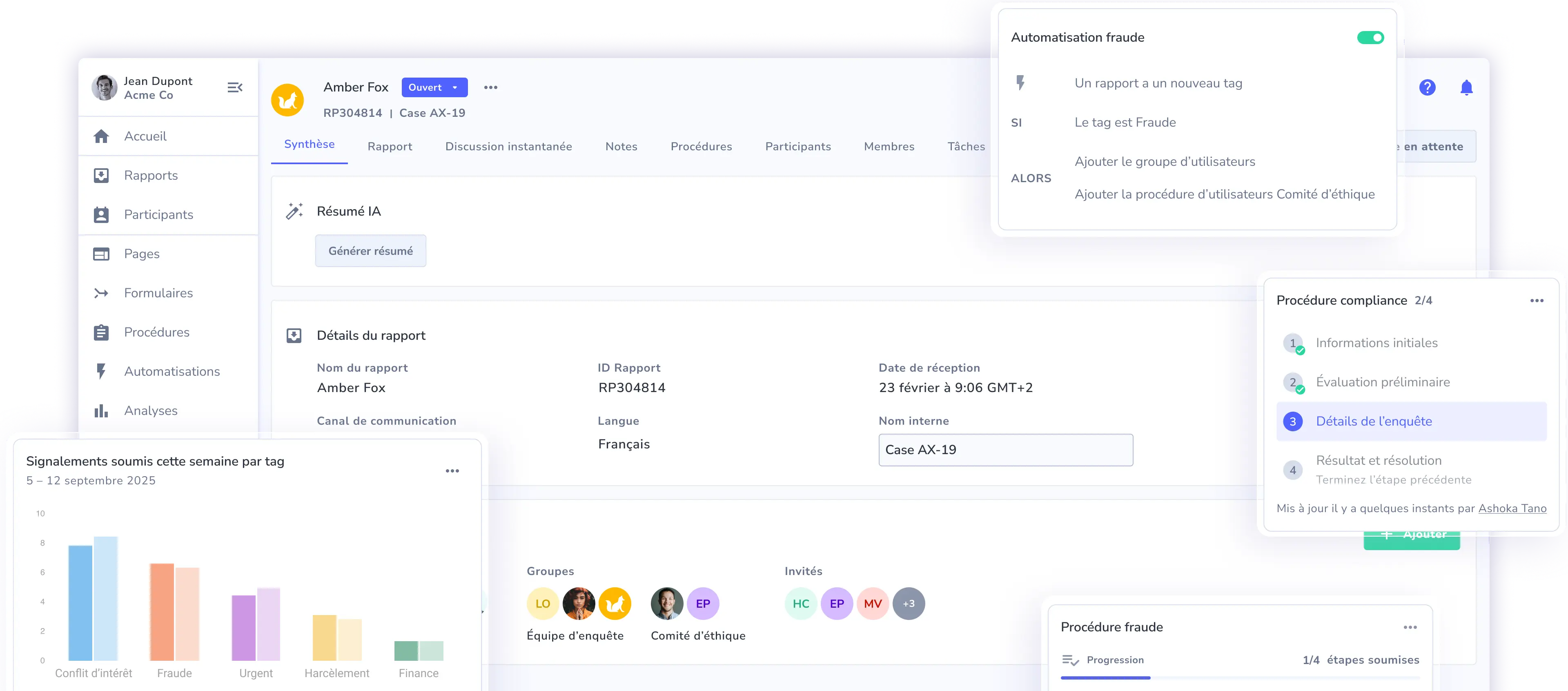 À la réception d’un signalement, Whispli structure instantanément son traitement grâce à des workflows configurables et à l’IA qui clarifie et priorise automatiquement les informations clés. Vos équipes collaborent en toute sécurité, appliquent des processus harmonisés et pilotent chaque dossier avec rigueur, jusqu’à sa résolution.