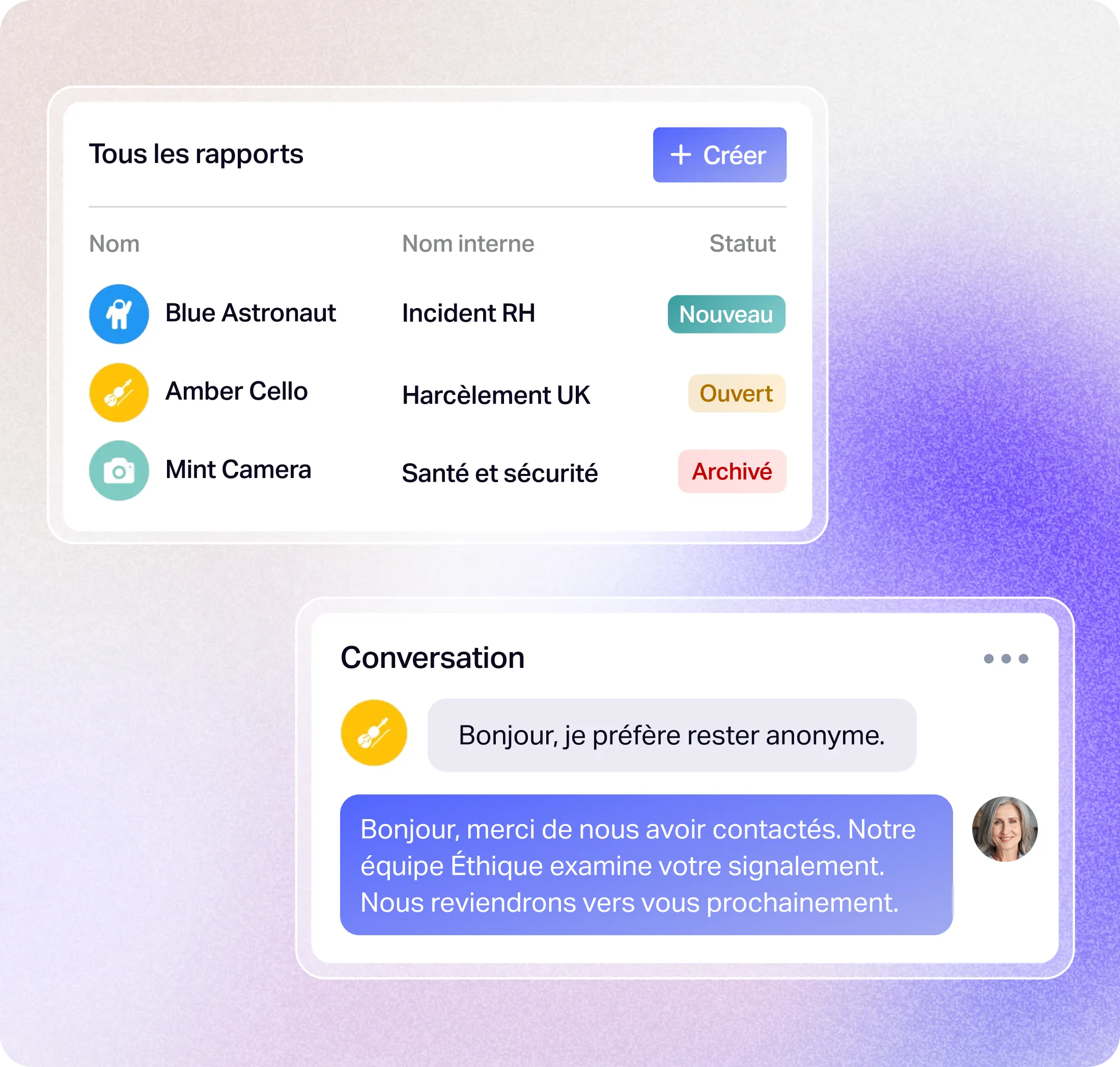 L’anonymat est intégré au cœur de l’architecture de Whispli. Grâce à une messagerie sécurisée dédiée, aucune adresse IP, identifiant d’appareil ou métadonnée n’est enregistré. Chaque lanceur d’alerte est représenté par un pictogramme unique, garantissant des échanges confidentiels sans compromettre son identité.