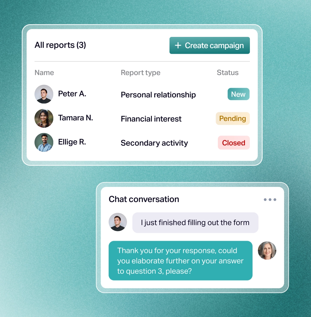 A dedicated solution for managing routine ethical declarations. Standardise and centralise non-anonymous disclosures, including Conflicts of Interest, Gifts and Hospitality logs, and custom compliance filings through structured workflows.
