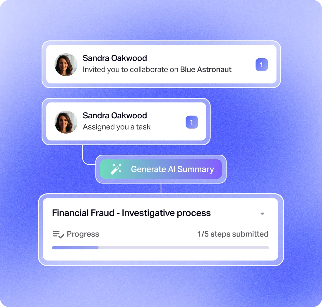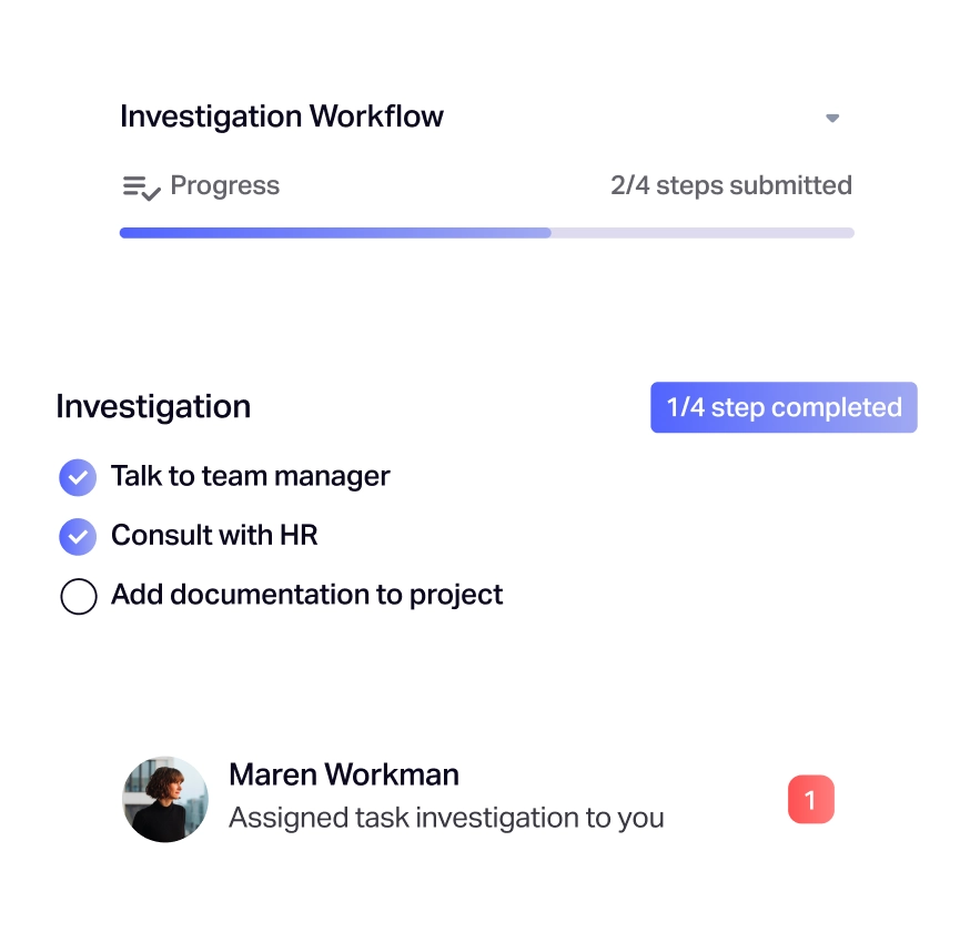 Build structured investigation workflows with defined tasks, deadlines and collaboration tools. Workflows help teams coordinate investigations, track responsibilities and ensure every step is completed consistently from intake to resolution.